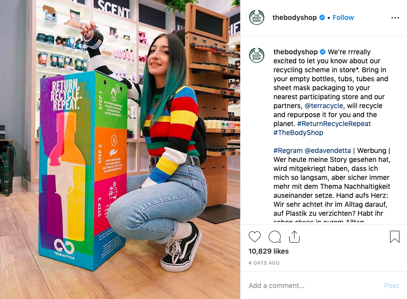 As part of this campaign The Body Shop launched an in-store recycling program where it encourages customers to return their empty bottles to the store so they can be recycled. Its’ social media platforms along with in-store signage are creating awareness of the initiative.